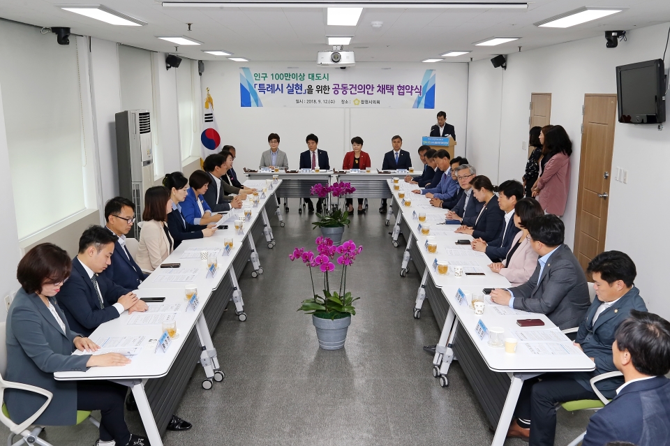 【뉴스라이트】 수원시의회(의장 조명자)를 비롯한 고양시의회, 용인시의회, 창원시의회는 12일 창원시의회 의장실에서 '인구 100만 이상 대도시 특례시 실현'을 촉구하는 공동 건의안 채택을 위한 협약식을 개최했다.