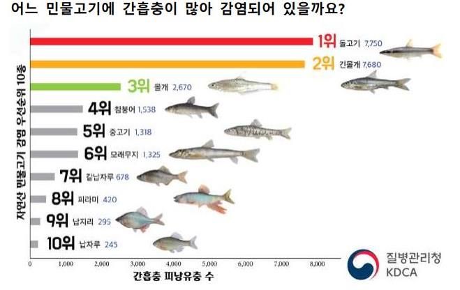 장내기생충 중 감염률이 가장 높은 간흡충은 하천의 자연산 민물고기 생식으로 감염되며, 간흡충이 많이 감염된 민물고기는 돌고기, 몰개, 참붕어 순으로 나타났다. 간흡충에 감염되면 만성 담도질환을 일으킬 수 있고 심한 경우 담관암을 유발할 수 있어 주의가 필요하다.