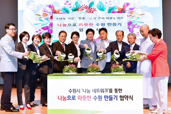 ‘나눔으로 따뜻한 수원 만들기 업무 협약식’도 진행됐다. 수원시·경기사회복지공동모금회·수원사회복지협의회·경기도수원교육지원청·수원시상공회의소·수원시기독교연합회·수원시불교연합회·수원산업단지관리공단·수원시의사회 등 수원시 대표 기관들이 모여 협약을 체결하고, 질병·빈곤 등으로 힘겨워하는 소외계층을 돕고 나눔문화 확산을 위해 협력하기로 했다.