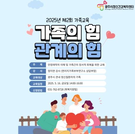 【뉴스라이트 = 김정민 기자】 광주시정신건강복지센터는 오는 16일 광주시보건소에서 정신질환자 가족을 대상으로 한 교육 프로그램 ‘가족의 힘, 관계의 힘’을 운영한다고 1일 밝혔다.