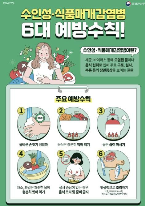 수인성ㆍ식품매개감염병은 병원성 세균, 바이러스, 원충에 오염된 물 또는 식품 섭취로 인해 구토, 설사, 복통 등의 장관 증상을 유발한다. 이를 예방하기 위해서는 ▲올바른 손 씻기 생활화 ▲음식은 충분히 익혀 먹기 ▲물은 끓여 마시기 ▲채소, 과일은 깨끗한 물에 충분히 씻어 먹기 ▲설사 증상이 있는 경우 음식 조리 및 준비 금지 ▲위생적으로 조리하기 등의 수칙을 준수해야 한다.
