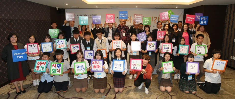 청소년들 뒤편은 아시아 인간도시 수원포럼에 참석한 도시 정상들이다.