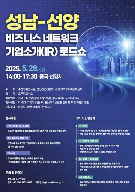 【뉴스라이트 = 김정민 기자】 성남산업진흥원은 성남시 유망 중소‧벤처기업의 중국 시장 진출과 투자 유치를 지원하기 위해 오는 5월 28일 중국 선양에서 IR(Investor Relations) 로드쇼를 개최한다.