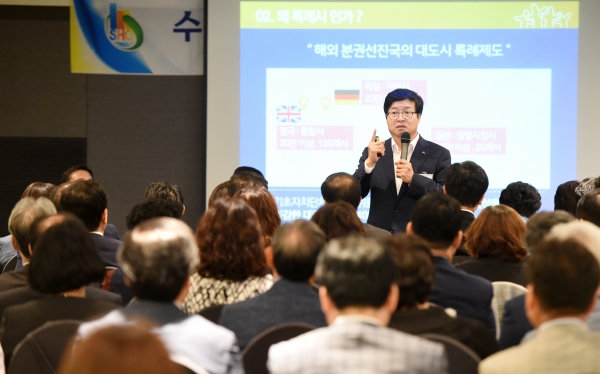 염태영 시장은 “특례시가 도입되면 지역이 중심이 되는 상향식 국가발전이 이뤄질 수 있다”면서 “중앙의 권한을 지방에 대폭 이양하는 행정체제 개혁이 절대적으로 필요하다”고 거듭 강조했다.