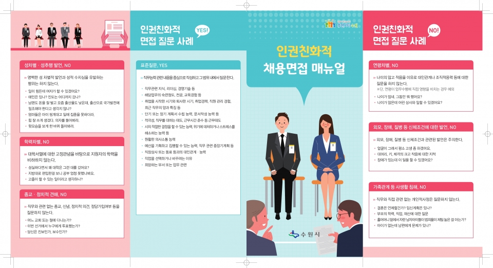 지난 8월 ‘인권친화적 채용 면접 매뉴얼’을 제작한 수원시는 모든 부서와 산하기관에 매뉴얼을 배포하고, 매뉴얼을 바탕으로 한 인권친화적 채용을 시행할 것을 권고했다.