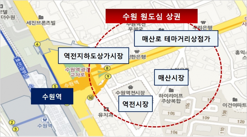수원역 주변 구도심 상권 활성화 사업은 매산로테마거리 상점가, 역전지하도 상가시장, 역전시장, 매산시장 등 수원역 역세권 4개 시장 일원의 상권을 활성화하는 사업이다.