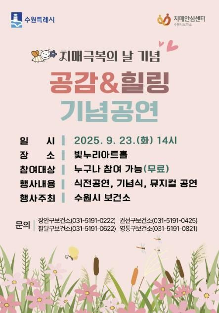 【뉴스라이트 = 조용은 기자】 수원시보건소가 치매극복의 날을 기념해 9월 23일 오후 2시 빛누리아트홀에서 ‘공감·힐링 기념 공연’을 개최한다.