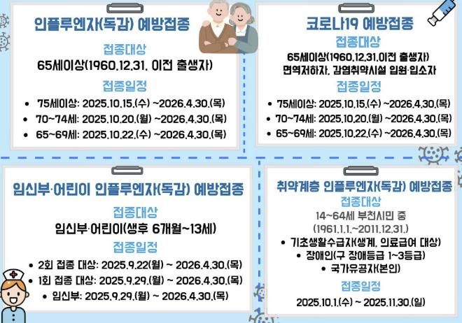 부천시는 이와 함께 14~64세 시민 중 기초생활수급자, 중증장애인, 국가유공자 본인 등 취약계층에 대해서도 무료 예방접종을 지원한다. 10월 1일부터 접종 가능하며, 접종 가능 의료기관은 부천시보건소 홈페이지에서 확인할 수 있다.