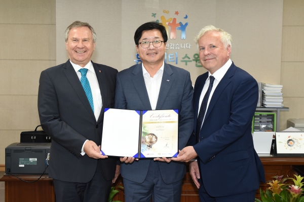 미하엘 슈바르칭어(Michael Schwarzinger) 주한 오스트리아 대사는 에너지글로브재단을 대신해 2일 수원시장 집무실에서 염태영 수원시장에게 수상 인증서를 전달하고 수상을 축하했다.