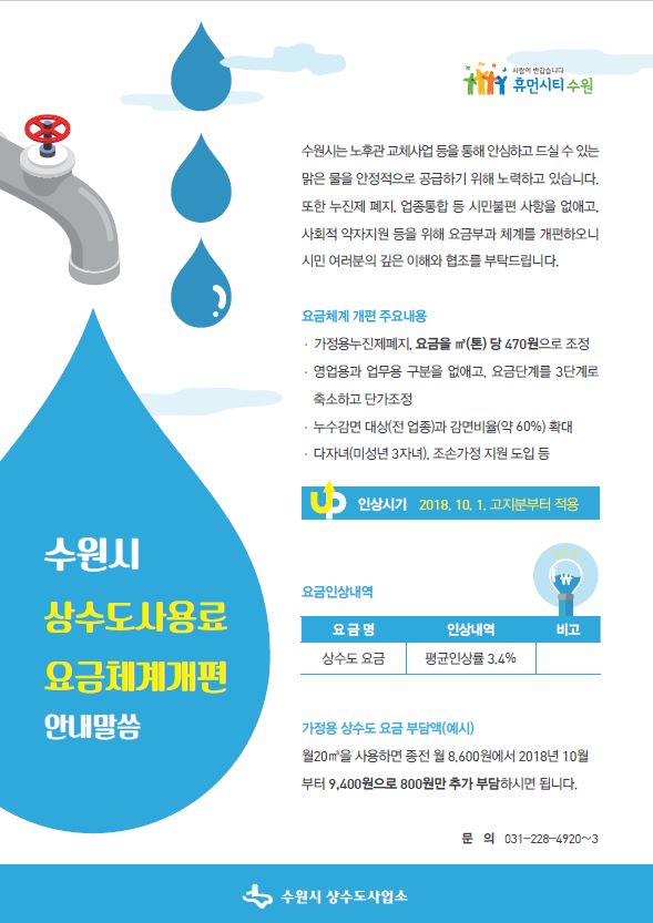 김종훈 수원시 상수도사업소장은 “시민들에게 깨끗한 물을 공급하기 위해 요금을 인상하게 됐다”면서 “시민 여러분의 많은 이해와 협조를 부탁드린다”고 말했다.
