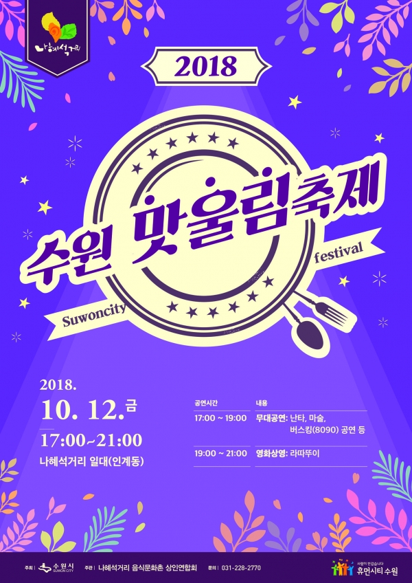 수원시가 12일 오후 5시부터 9시까지 나혜석거리(팔달구 인계동)에서 ’수원 맛울림 축제’를 연다.
