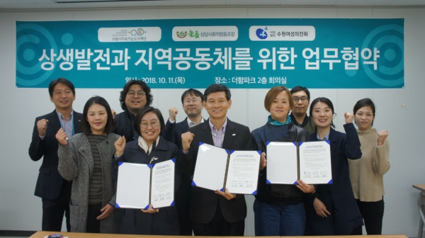수원시지속가능도시재단과 늘품사회적협동조합, 수원여성의전화는 11일 권선구 더함파크 회의실에서 ‘상생발전과 지역공동체를 위한 업무협약’을 체결하고, 매산동 도시재생뉴딜사업의 성공적 진행과 수원시민의 삶의 향상을 위해 협력하기로 했다.
