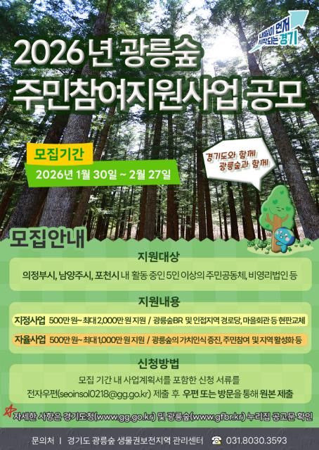 【뉴스라이트 = 조용은 기자】 경기도가 광릉숲 생물권보전지역 활성화를 위해 2026년 광릉숲 주민참여지원사업 참여자를 모집한다.