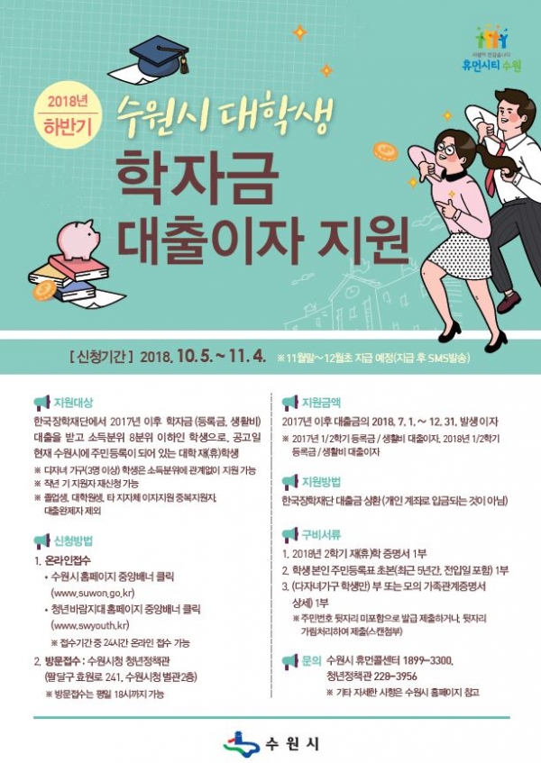 수원시는 다음 달 4일까지 ‘2018년 하반기 대학생 학자금 대출이자 지원 사업’ 참여 대학생을 모집한다.