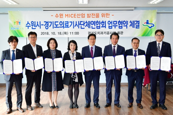 수원시와 경기도의료기사단체연합회는 18일 팔달구 경기도치과기공사회 회관에서 ‘종합학술대회 장기 사용을 위한 업무협약’을 체결하고, 매년 4월 개최 예정인 경기도의료기사단체연합회 종합학술대회를 2019년부터 5년간 수원컨벤션센터에서 열기로 했다.