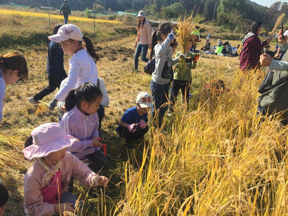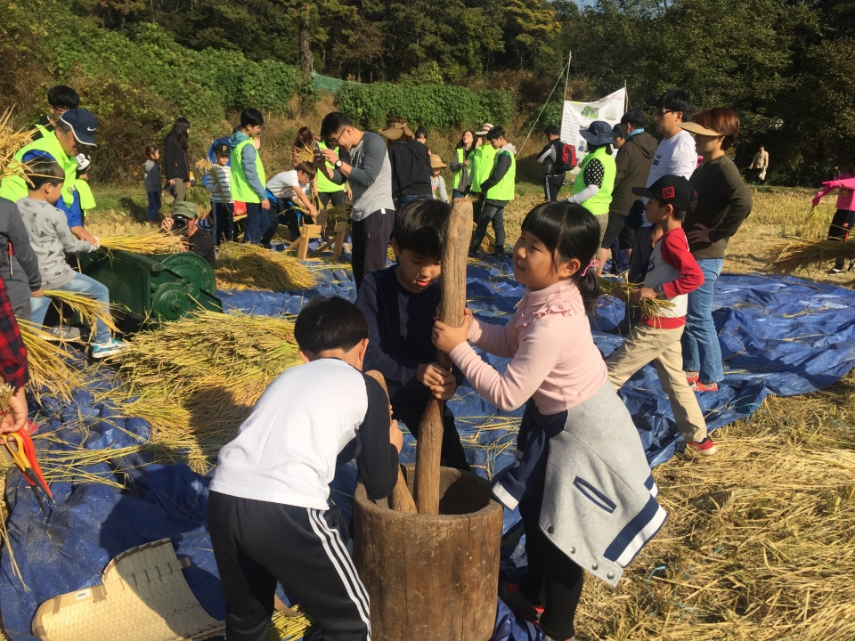 칠보산 풍물마당팀의 풍물공연으로 시작된 이날 행사는 ▲풍년에 감사하는 추수감사제 ▲박광래 농촌진흥청 박사의 친환경 논농사 이야기 ▲벼 베기 체험 ▲전통방식 탈곡 체험 ▲볏짚 공예, 논습지 생물관찰 등 ‘가을들판 체험 한마당’으로 진행됐다.
