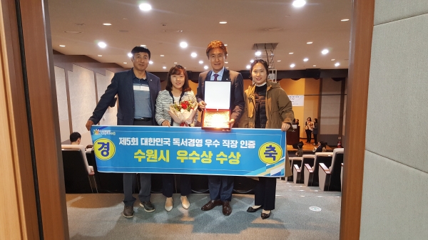 수원시가 23일 서울 안중근의사기념관에서 개최된 ‘제5회 대한민국 독서경영 우수 직장 인증’에서 우수상을 받았다.