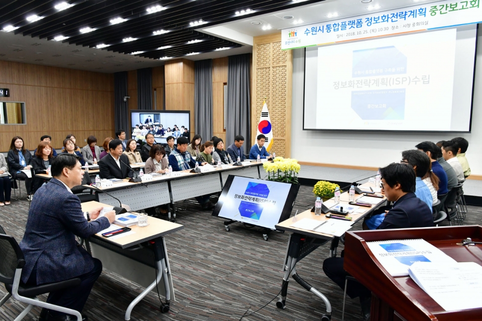 수원시는 25일 시청 중회의실에서 ‘통합플랫폼 구축을 위한 정보화전략계획 수립 용역 중간 보고회’를 열고, ‘디자인 씽킹’ 워크숍, 부서 관계자 인터뷰 등을 바탕으로 발굴한 공공서비스 모델(이행과제) 10개를 소개했다.