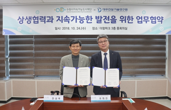 수원시지속가능도시재단과 대우건설기술연구원은 24일 권선구 더함파크 중회의실에서 상호협력체계 구축을 위한 업무협약을 체결했다.
