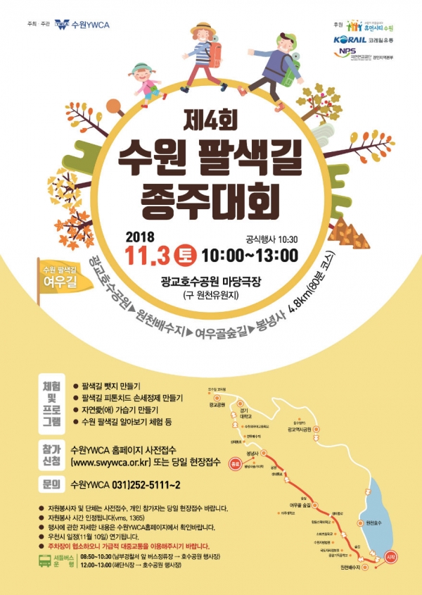 수원의 역사·문화·자연을 보고 느낄 수 있는 ‘제4회 수원 팔색길 종주대회’가 11월 3일 오전 10시 광교호수공원 마당극장에서 열린다.