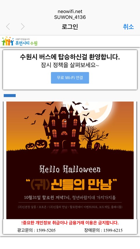 이번 협약에 따라 수원 시내버스 안에서 무료와이파이를 연결하면, 연결 메시지창과 함께 수원시 청년정책 관련 포스터와 지원 내용 등이 팝업창에 뜬다.