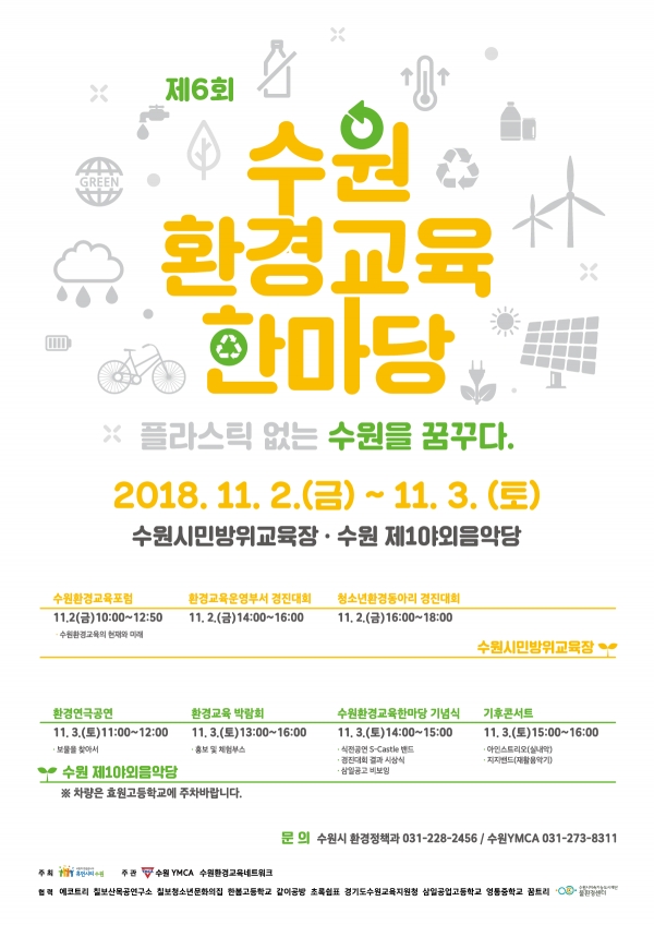수원시가 주최하고 수원YWCA와 수원환경교육네트워크가 주관해 열리는 이번 행사는 ‘플라스틱 없는 수원을 꿈구다’를 슬로건으로, ‘환경교육 시범도시 수원’의 완성을 위한 환경교육포럼, 청소년환경동아리 경진대회, 환경연극공연 등 다채로운 프로그램을 선보인다.
