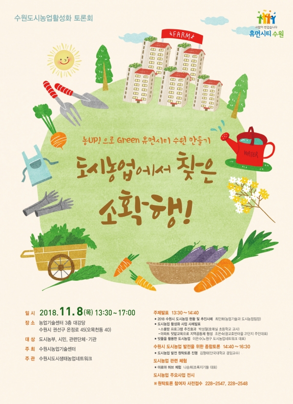수원시가 8일 오후 1시 30분부터 5시까지 수원시농업기술센터 3층 대강당에서 도시농업 활성화를 위한 토론회를 연다.
