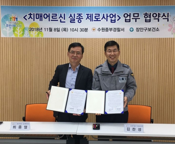 수원시장안구보건소가 수원중부경찰서는 8일 장안구보건소 치매안심센터에서 ‘치매 어르신 실종제로사업 업무협약’을 체결하고, 치매 어르신 보호에 협력하기로 했다.