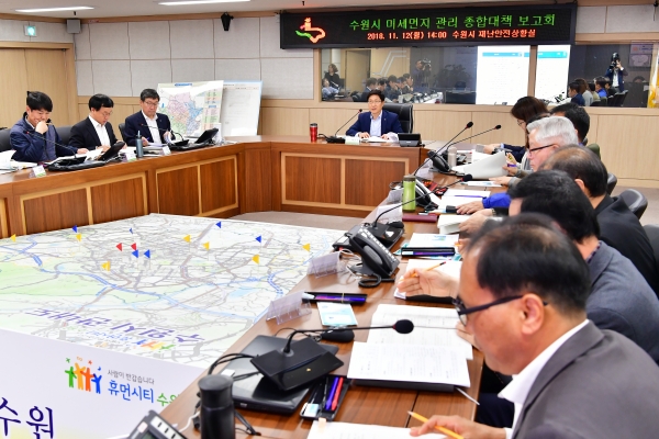 ‘미세먼지 걱정 없는 안전한 도시’를 목표로 하는 수원시는 12일 시청 재난상황실에서 백운석 제2부시장 주재로 ‘미세먼지 관리 종합대책 추진상황 보고회’를 열고, 5대 핵심전략과 단위 사업 추진 상황을 점검했다.