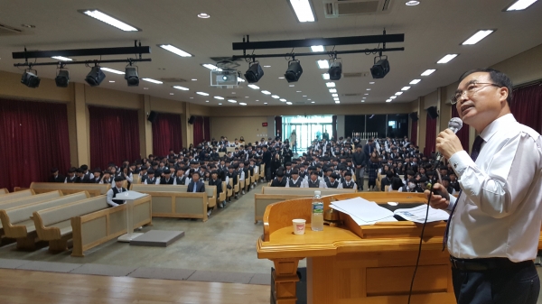 송영완 수원시 문화체육국장은 12일 삼일공고 강당에서 학생 400여 명이 참석한 가운데 ‘특성화고 취업마인드 함양과 진로역량 강화’를 주제로 강연을 펼쳤다.