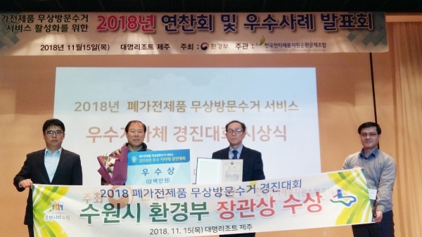 수원시는 환경부가 주최하고 한국전자제품자원순환공제조합이 주관하는 ‘2018년 폐가전제품 무상 방문수거 우수지자체 경진대회’에서 우수지자체로 선정돼 환경부장관상을 받았다. 시상식은 15일 제주 대명리조트에서 열렸다.