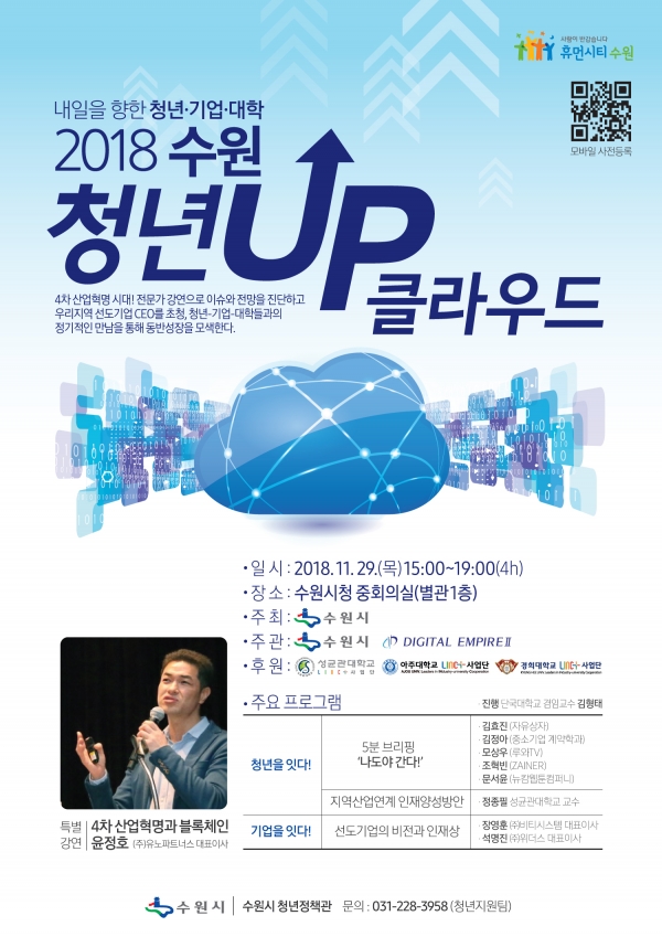 수원시와 ‘디지털엠파이어Ⅱ협의회’는 ‘2018 청년UP(업) 클라우드’에 참가할 수원청년 100명을 27일까지 모집한다.