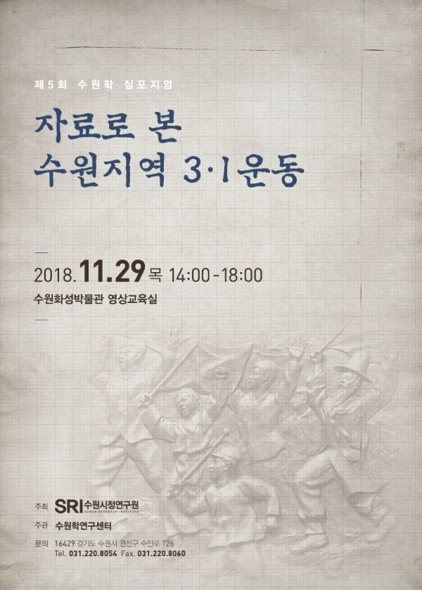 수원시정연구원은 29일 오후 2시 수원화성박물관 영상교육실에서 ‘자료로 본 수원지역 3.1운동’을 주제로 제5회 수원학 심포지엄을 개최한다.