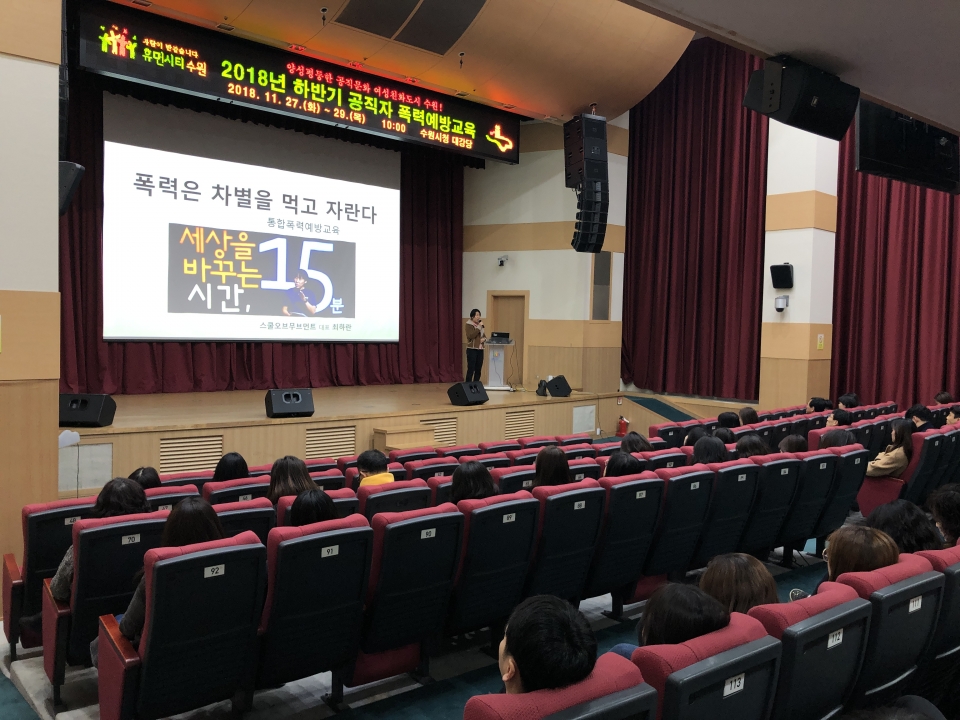 수원시는 27~29일 시청 대강당에서 공직자 600여 명을 대상으로 4대 폭력(성희롱·성폭력·가정폭력·성매매) 예방 교육을 했다.