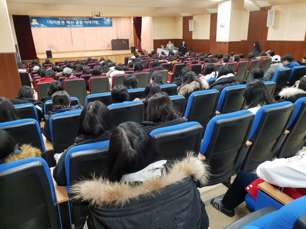 29일 수원외고 208명의 학생이 참석한 가운데 ‘내 삶을 바꾸는 자치와 분권’을 주제로 강연한 우지영 지방정치연구소장은 “지방분권은 시민과 더 가까운 지방정부가 시민의 생활을 책임지고 살필 수 있도록 중앙정부로부터 일정 권한을 위임받는 것”이라며 “중앙정부와 지방정부가 역할과 책임을 합리적으로 분담해야 한다”고 말했다.