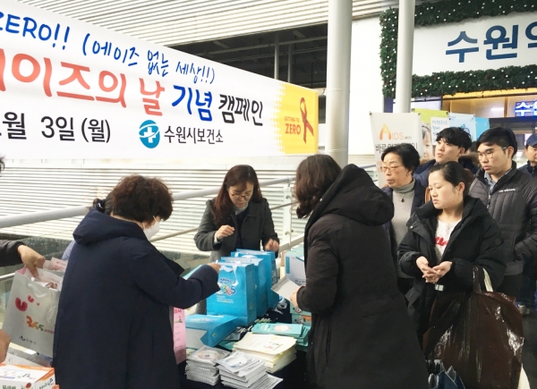 수원시 보건소가 ‘제31회 세계 에이즈의 날(매년 12월 1일)’을 맞아 3일 수원역 환승센터에서 에이즈(AIDS)에 대한 정확한 정보를 알리고, 감염병 예방을 위한 캠페인을 전개했다.