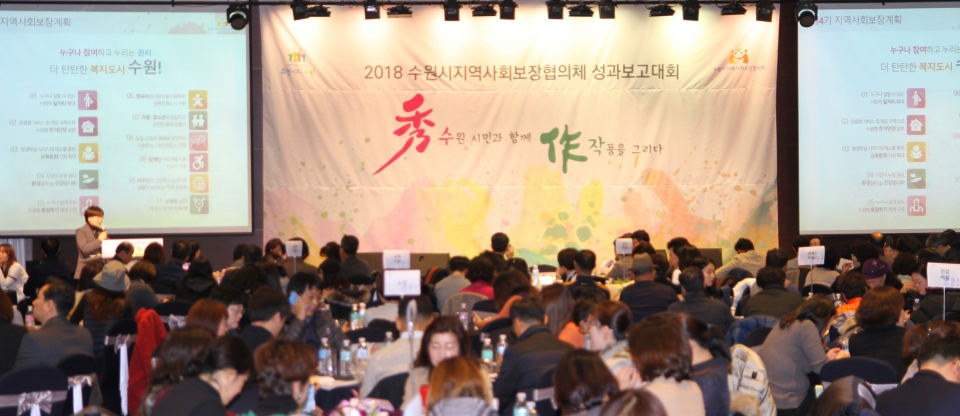 수원시와 수원시지역사회보장협의체는 7일 노보텔 앰배서더 수원에서 ‘2018 수원시 지역사회보장협의체 성과 보고대회’를 열고, 시·동 지역사회보장협의체의 성과를 공유했다.
