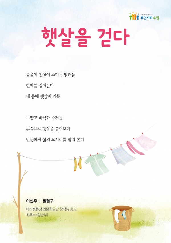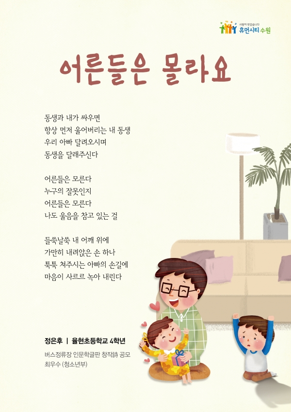 수원시 ‘제12회 버스정류장 인문학글판’ 공모에서 정은후 학생(율현초 4)의 ‘어른들은 몰라요’와 이선주씨(수원 팔달구)의 ‘햇살을 걷다’가 각각 청소년부·일반부 최우수작으로 선정됐다.