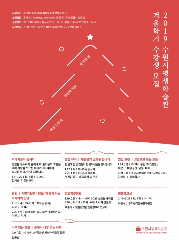 수원시평생학습관이 ‘겨울학기 강좌’ 수강생을 모집한다.