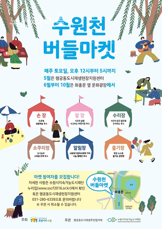 안상욱 수원시지속가능도시재단 이사장은 “다양한 마을 주체가 참여하는 수원천 버들마켓은 행궁동 주민의 소통 창구 역할을 할 것”이라며 “수원천 버들마켓이 주민이 주도하는 도시재생사업을 전개하는 데 도움이 되길 바란다”고 말했다.