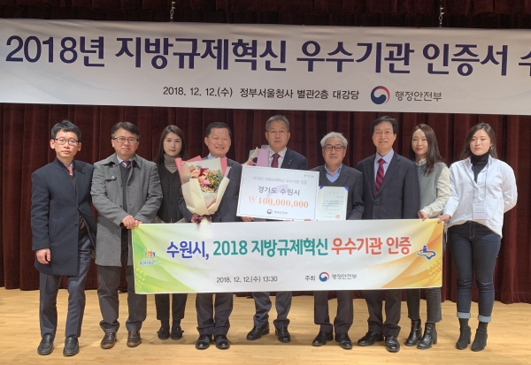 수원시는 12일 정부서울청사 별관에서 열린 ‘2018년 지방규제혁신 인증 수여식’에서 인증서를 받았다. 재정인센티브로 특별교부세 1억 원을 받는다.