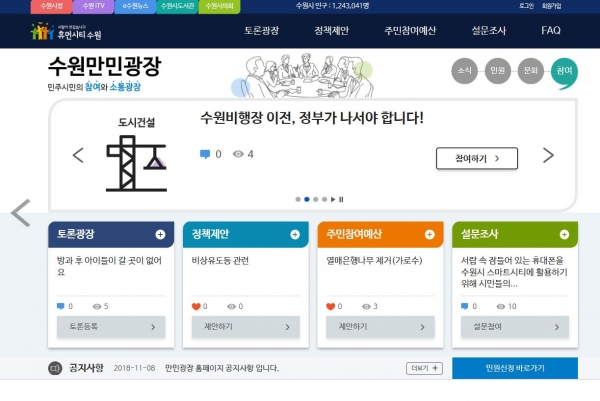 수원만민광장은 ▲토론광장 ▲정책제안 ▲주민참여예산 ▲설문조사 등 네 가지 메뉴로 이뤄져 있다.