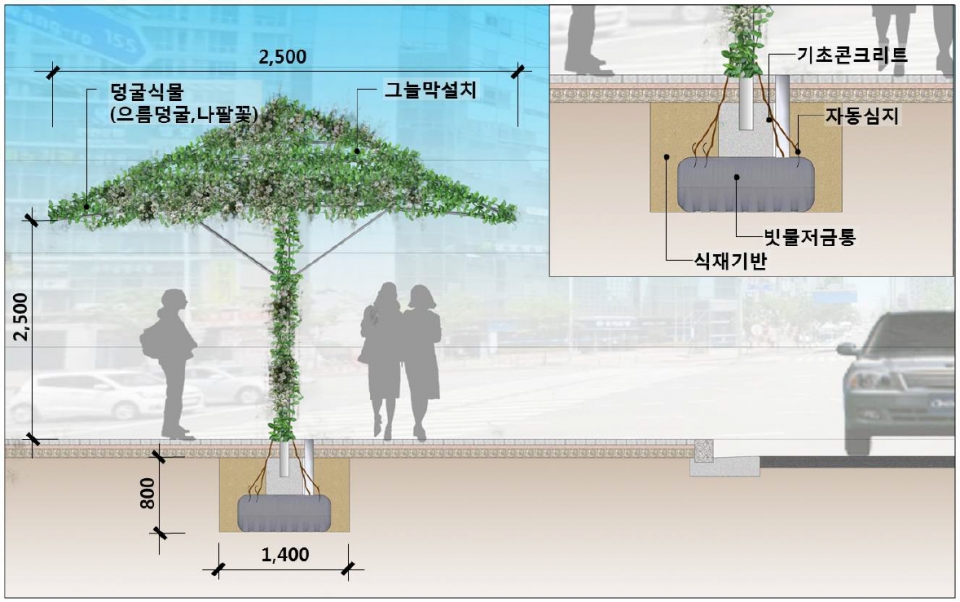 나무를 심기 어려운 장소에는 그늘막 형태의 구조물을 세우고, 나팔꽃·여주·으름·다래 등 넝쿨식물을 올려 그늘시렁을 만들 예정이다.