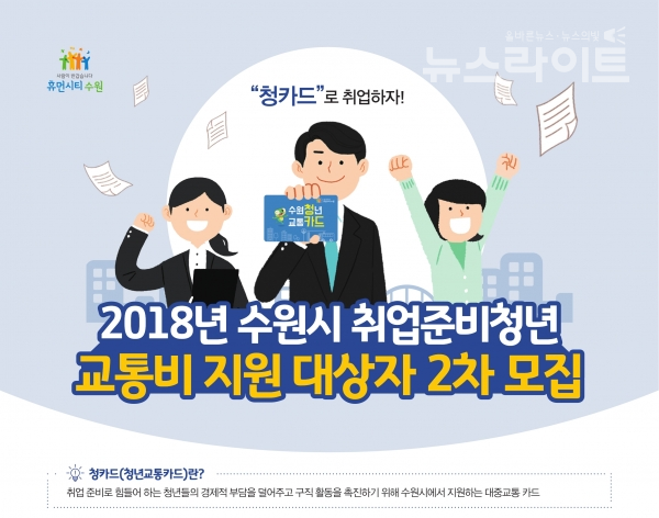 【뉴스라이트】 수원시는 26일까지 취업을 준비하는 만 19~34세 수원청년들을 대상으로 ‘청카드’(청년교통카드) 지원 대상자 295명을 추가 모집한다.