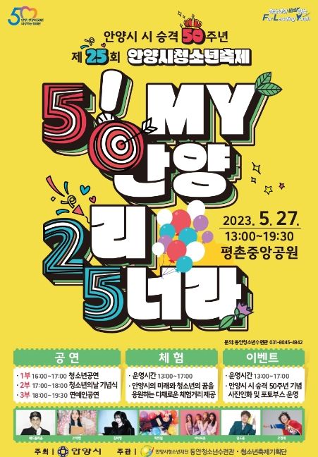 【뉴스라이트 = 이양지 기자】 오는 27일 ‘안양시 청소년의 날’에 평촌중앙공원에서 제25회 안양시 청소년 축제 ‘5! my 안양 2리 5너라’가 열린다.