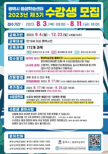 【뉴스라이트 = 박현서 기자】 평택시 평생학습센터가 시민 누구나 언제 어디서든 배울 수 있는 양질의 다양한 교육프로그램을 제공하기 위해 오는 8월 3일부터 ‘2023년 제3기 정기교육프로그램 수강생 모집’을 실시한다.