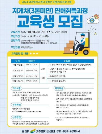 맞춤형 취업지원 프로그램의 일환으로 실시하는 3톤 미만 지게차 면허 취득과정은 여주시 거주하는 35세부터 54세 이하 미취업자를 대상으로 실시하며, 총 12명의 교육생을 선착순 모집한다.