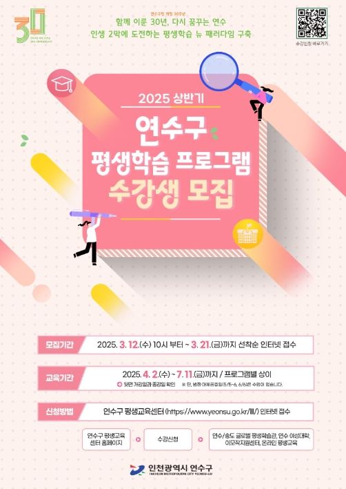 【뉴스라이트 = 이세현 기자】 연수구가 연수·송도 글로벌 평생학습관 ‘2025년 상반기 평생학습 프로그램’ 수강생을 모집한다.