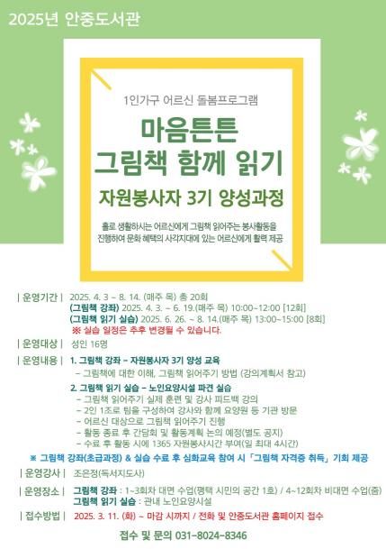 올해 3기를 맞이한 '마음튼튼 그림책 함께 읽기'는 자원봉사자 양성 교육을 통해 배출된 시민 활동가들이 지역 요양원 및 홀로 생활하시는 어르신을 방문하여 그림책을 읽어주며 정서적 안정과 소통의 기회를 제공하는 1인 가구 어르신 돌봄 프로그램이다.