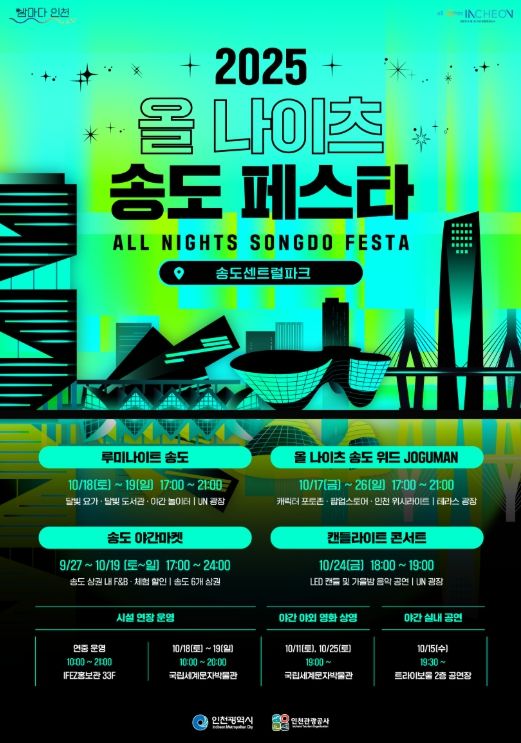 【뉴스라이트 = 이세현 기자】 인천광역시와 인천관광공사는 오는 10월 17일부터 26일까지 송도센트럴파크 일대에서 '2025 올 나이츠 송도 페스타'를 개최한다고 밝혔다.